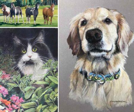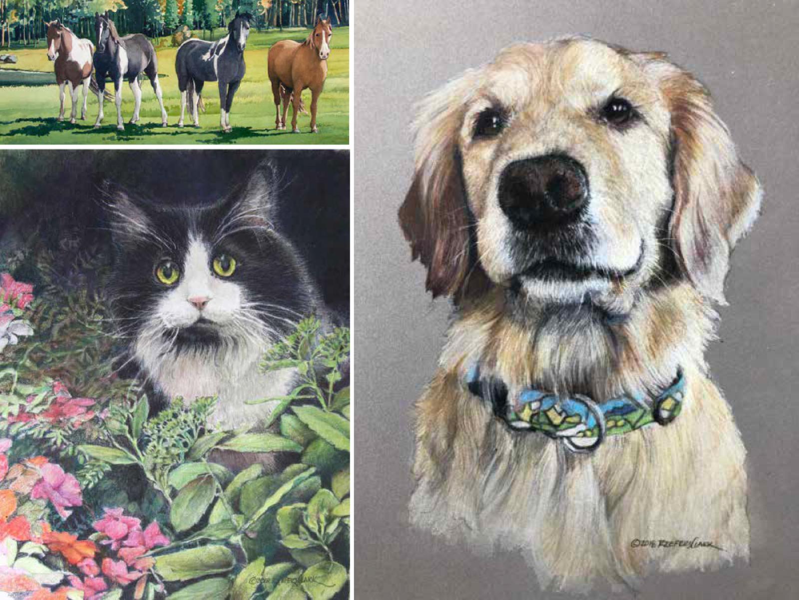 In addition to dogs, Clark also does cats and horses with watercolor and hyperrealistic colored pencil techniques. An artist for over 30 years, Clark’s impressive work belies the fact that pet portraits are a relatively new venture for her.